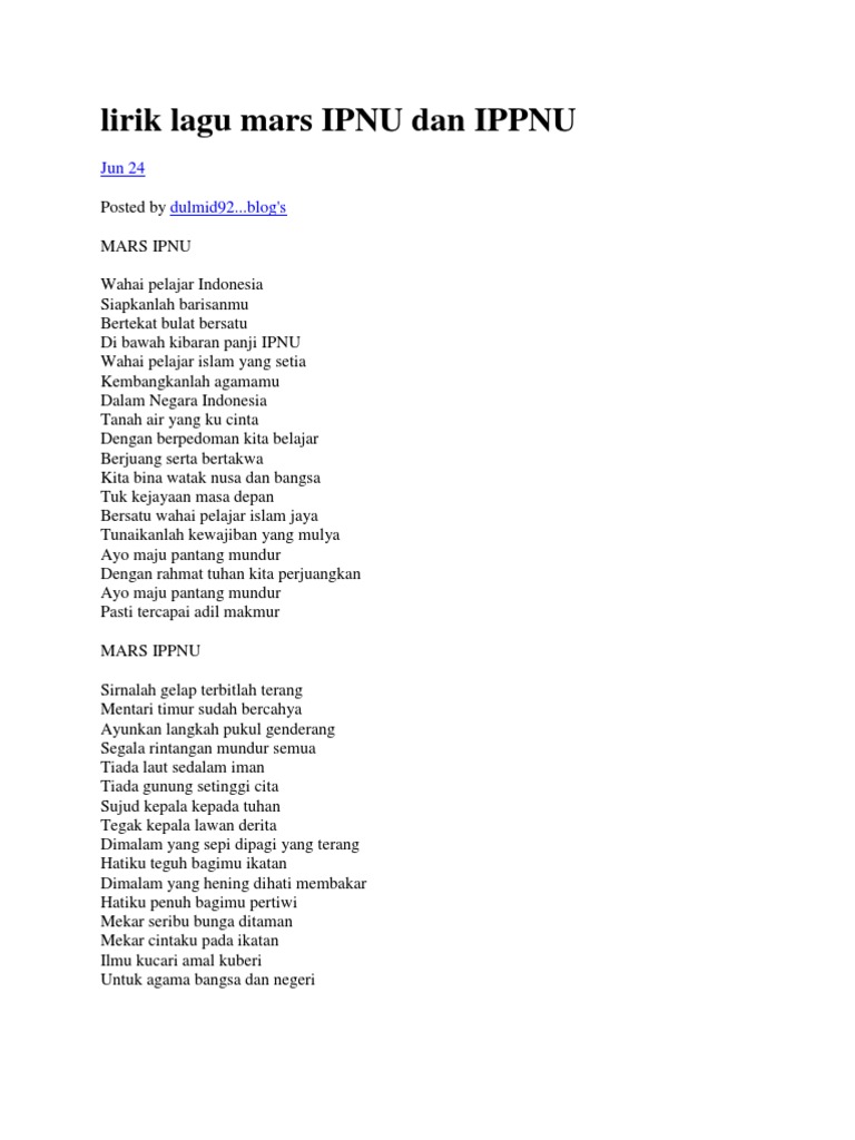 Lirik Lagu Mars Ipnu Dan Mars Ippnu Download Mp3. MARS IPNU Wahai pelajar Indonesia Siapkanlah barisanmu Bertekat bulat bersatu Di bawah kibaran panji IPNU Wahai pelajar islam yang setia Kembangkanlah agamamu Dalam Negara Indonesia Tanah air yang ku cinta Dengan berpedoman kita belajar Berjuang serta bertakwa Kita bina watak nusa dan bangsa Tuk kejayaan masa depan Bersatu wahai pelajar islam jaya Tunaikanlah kewajiban yang.