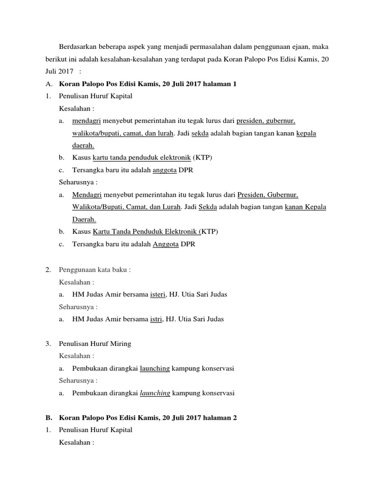 Contoh Kesalahan Eyd Di Surat Kabar Palopo Pos Edisi 20 Juli 2017