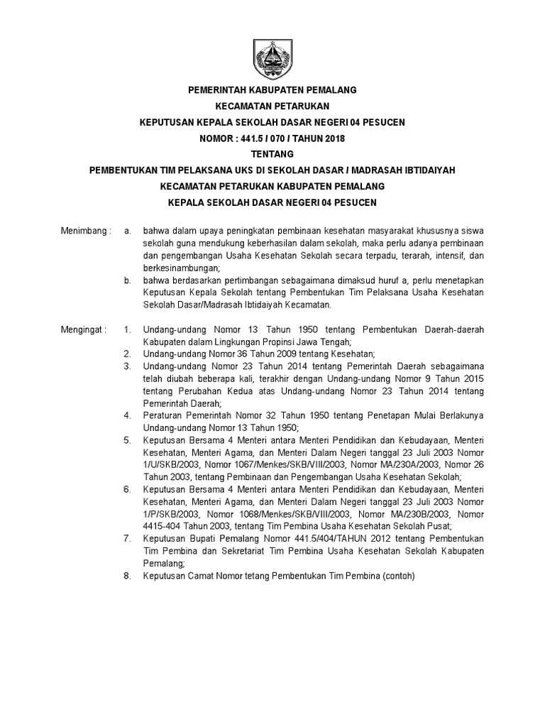 Dalam rangka kelancaran pelaksanaan UKS ditetapkan. KEPUTUSAN CAMAT BATURETNO NOMOR. Contoh sk uks smp 2019.